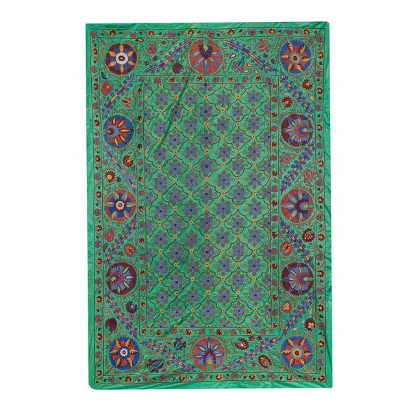 “Suzani” derives from the Persian word "suzan" for "needle" and refers to bright silk embroidered wall hangings and bedspreads that adorned homes of people on festive occasions. Suzanis are practical yet decorative items that took months for 1-2 individuals to make. There are variations in the shade of the silk thread used to embroider this, as is commonly seen in older suzanis that were made for personal use in people’s homes.