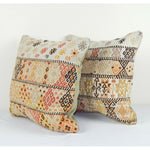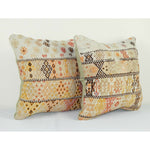 These beautiful 16" x 16" pillow covers were made from an authentic, vintage Turkish rug handwoven in the 1960s. Bright colors of wool adorn the front of the pillow and the cotton back has a hidden zipper enclosure. Makes a gorgeous addition to any couch, chair or bed.