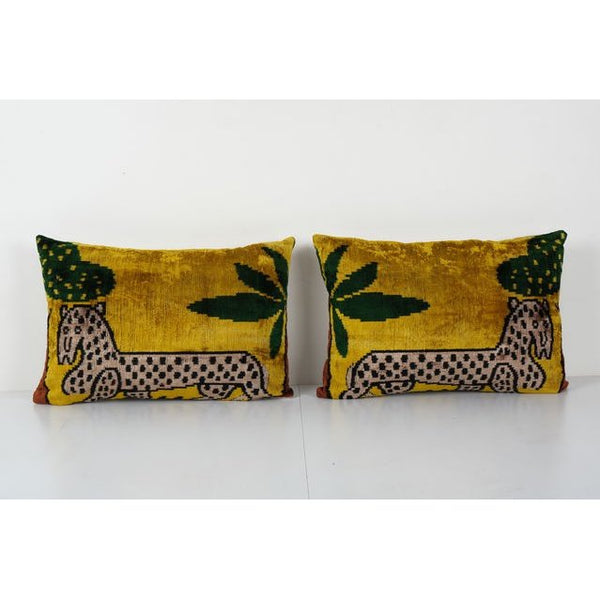 Animal Ikat Velvet Pillow, Set Pink Silk Lumbar Cushion Cover, Abstract Gold Pictorial Designer Pillow Case 16''' x 22''