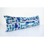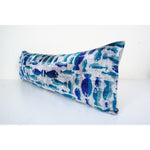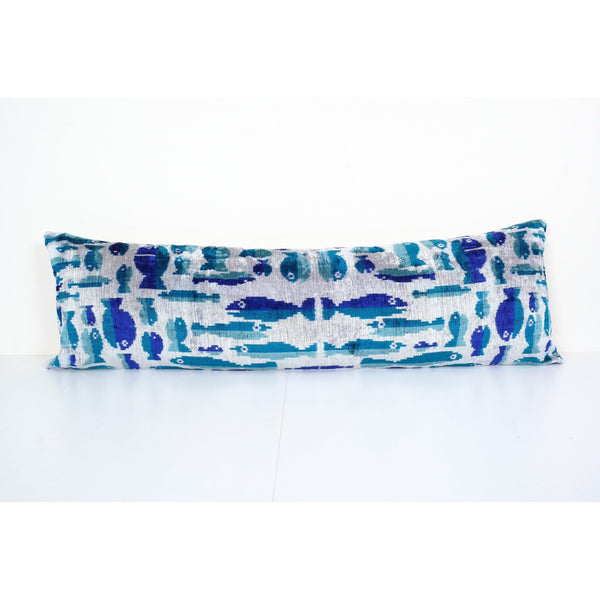 Extra Long Silk Ikat Velvet Pillow with Fish Motifs, Turquoise Velvet Cushion