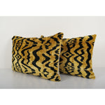 Gold Tiger Ikat Velvet Pillow, Set of Two Bengal Motifs Silk Lumbar Cushion
