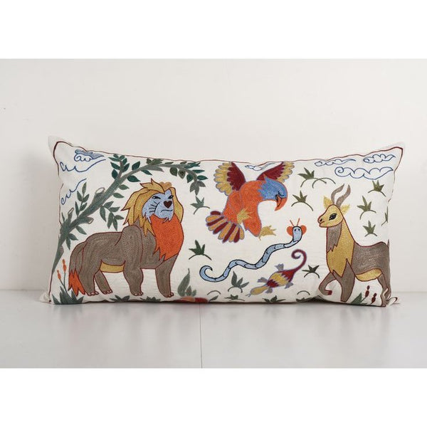 Suzani Handmade Pillowcase with Deer, Lion, Bird and Snake Motifs 18'' x 35''